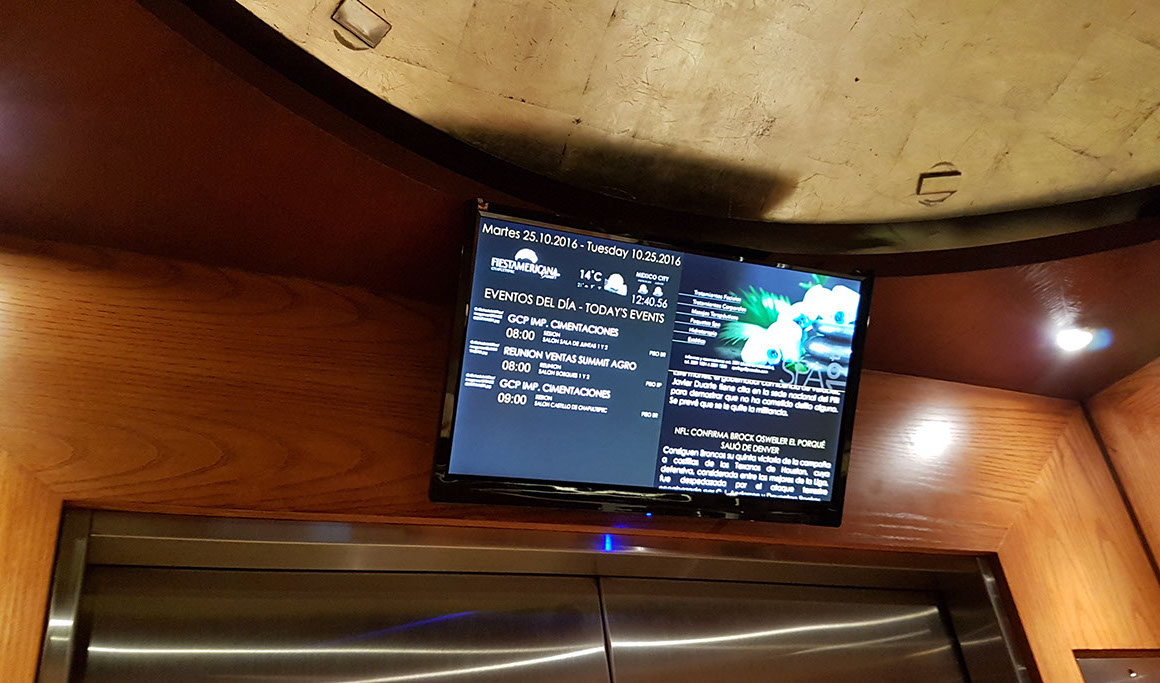 En la pantalla de Elevadores se muestra una plantilla con espacios (recuadros) para mostrar información hacia los huéspedes mientras hacen el trayecto en el elevador, los espacios de información pueden ser administrados via remota por la oficina designada a administrar el contenido, así cualquier actualización será reflejada en el momento.