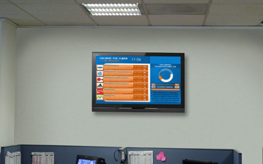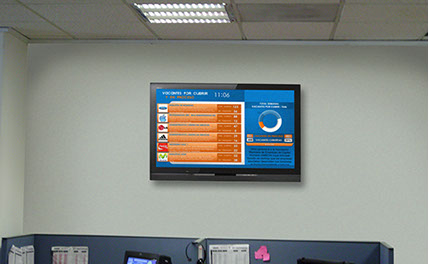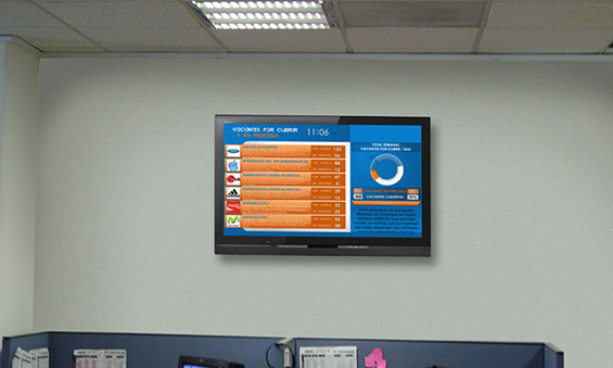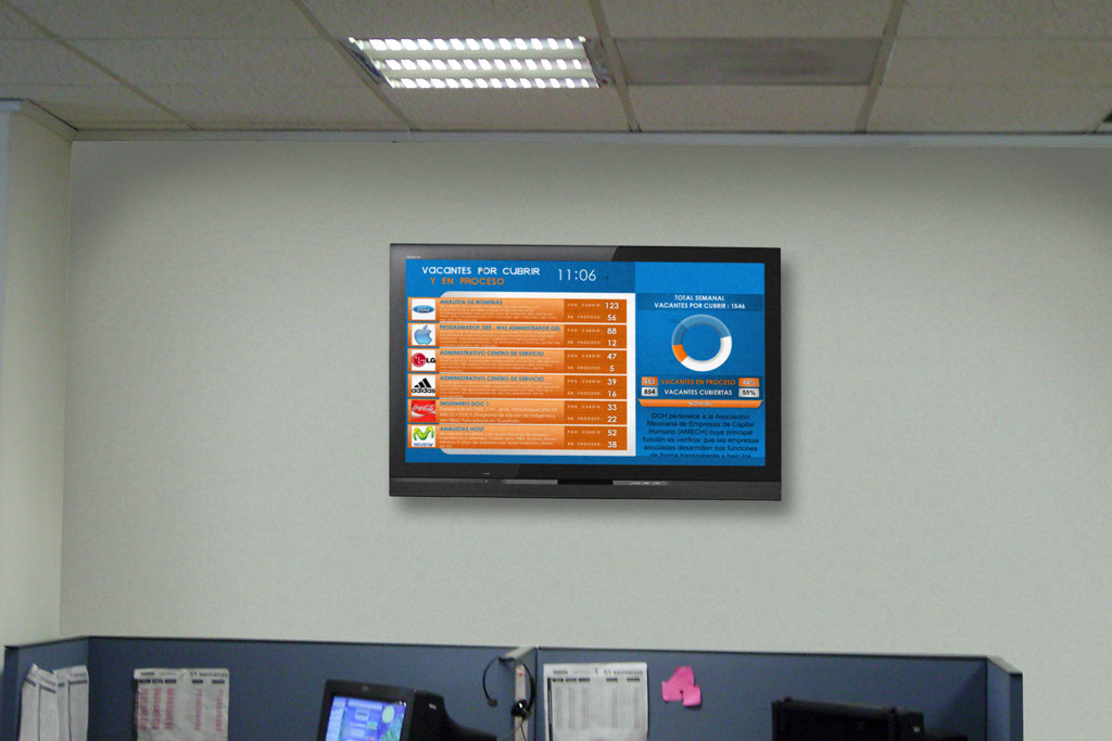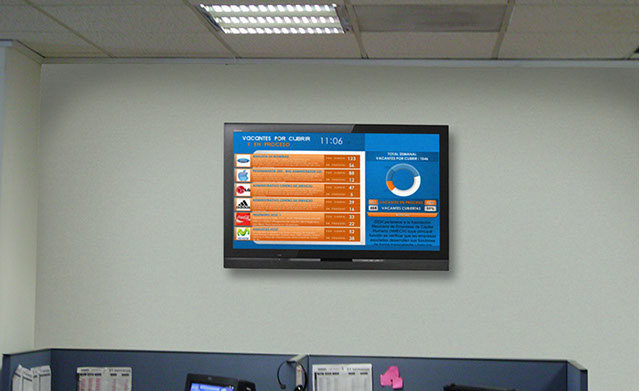 La pantalla de Recursos Humanos reemplaza o sirve como apoyo al panel de anuncio para empleados, en ella se muestra una plantilla con espacios para mostrar información hacia los empleados simultáneamente, los espacios de información pueden ser administrados por el personal de la oficina de recursos humanos, así cualquier actualización será reflejada en el momento.
